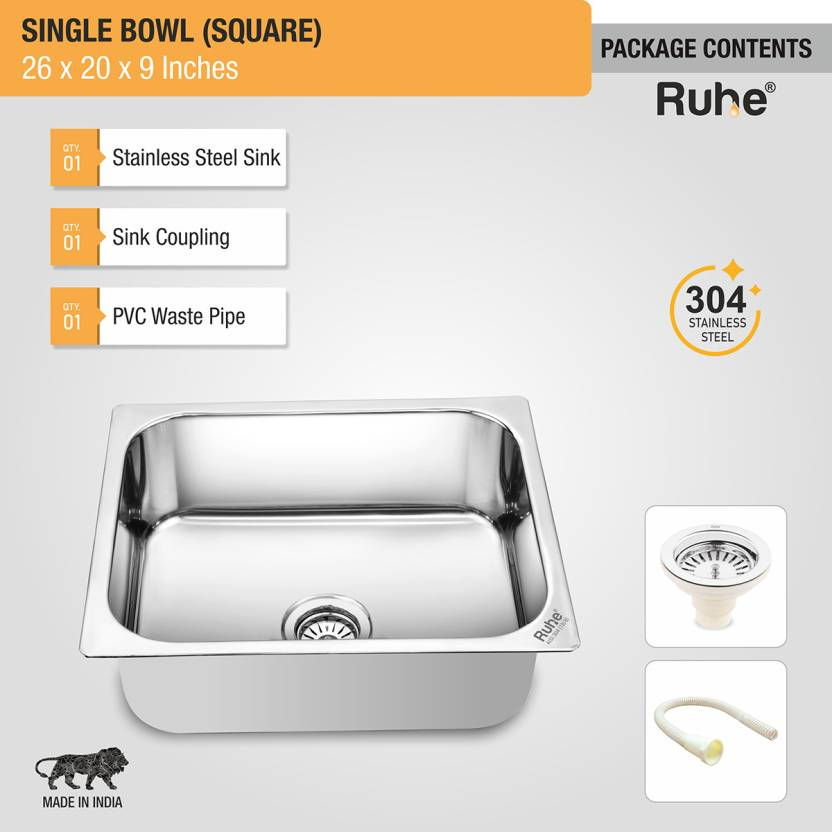 RUHE Square Single Bowl 26x20x9 Inches Kitchen Sink